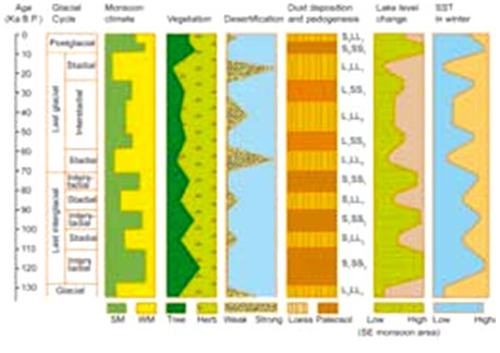 90年代初,安芷生等論證了最近 250萬年的中國黃土 ?古土壤序列是東亞季風變遷的良好記錄,系統提出了我國陸地和海洋不同類型地質生物和歷史文獻記錄的季風變遷證據,給出了確切描述東亞季風變化的代用指標,為探索東亞環境變化機制和理解不同因素相互間的關系提供了新途徑。明確指出,至少自中新世以來,東亞環境變化受東亞季風變遷控制,東亞冬、夏季風氣候優勢期的相互交替是東亞季風變遷的主要特征,過去東亞季風變遷受太陽輻射和包括全球冰量、海洋和海陸分布格局等因素變化的影響。此后還提出了東亞季風變遷的不穩定性、周期性等特征,明確指出了亞洲季風演化、內陸干旱化與青藏高原階段性隆升的耦合關系,揭示了東亞季風千年尺度的高頻振蕩特征及其與高低緯乃至南半球古氣候的聯系,深刻認識到東亞季風變遷可視為太陽輻射條件下海陸氣和冰系統相互作用在東亞的表現。